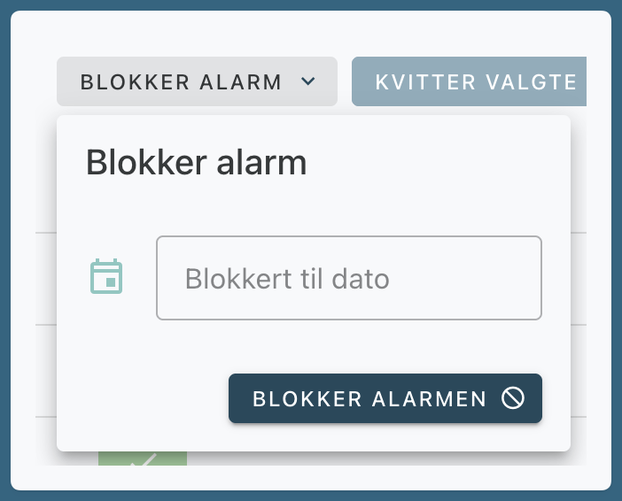 Du kan blokkere en alarm om du ikke ønsker flere hendelser registrert en periode, f.eks under service og vedlikehold på anlegget.