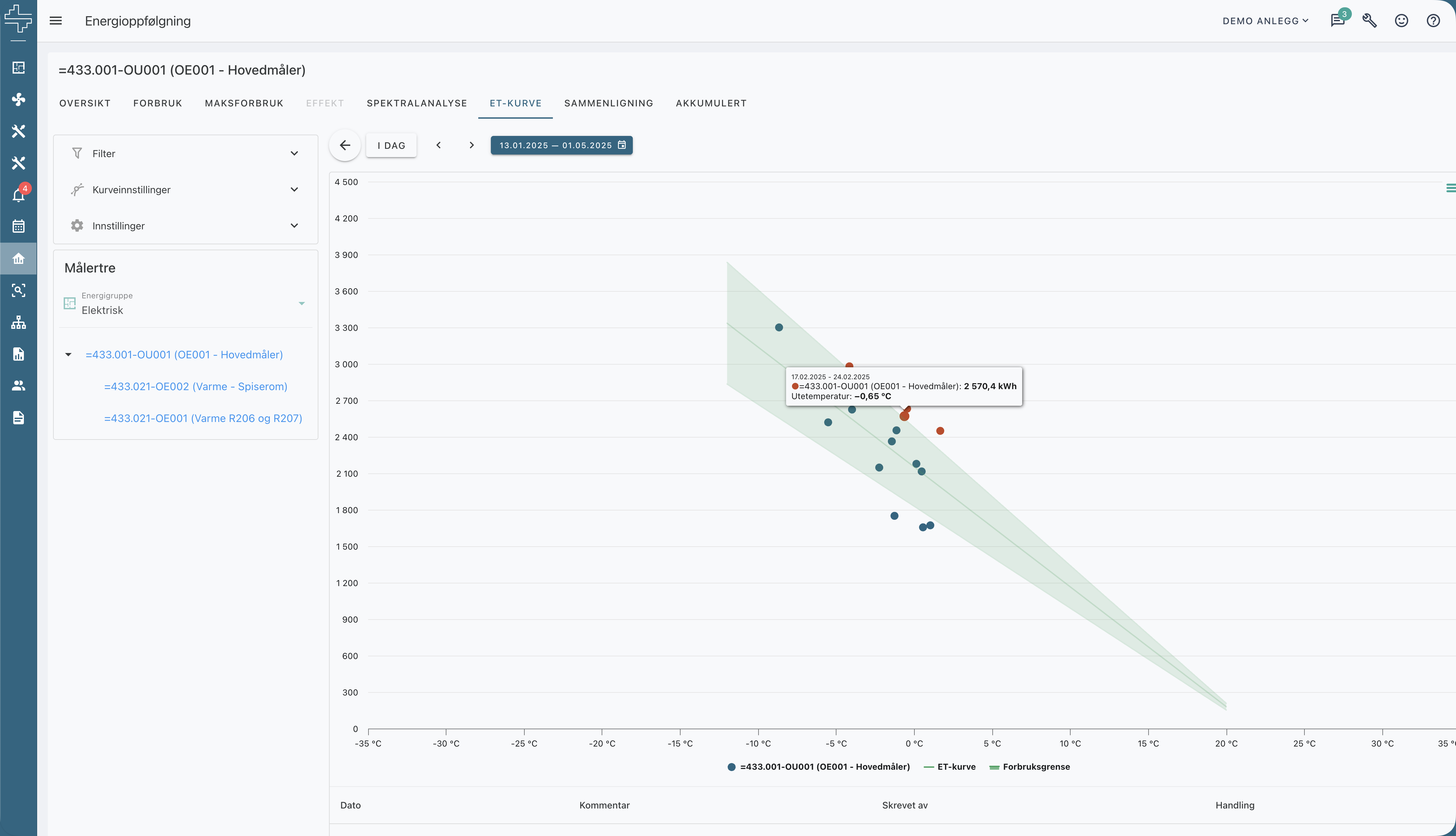 De blå punktene bør ligge så nær den grønne linjen som mulig. Hvis et punkt overskrider de grønne ytterlinjene, indikerer dette et avvik med høyere forbruk enn forventet.
