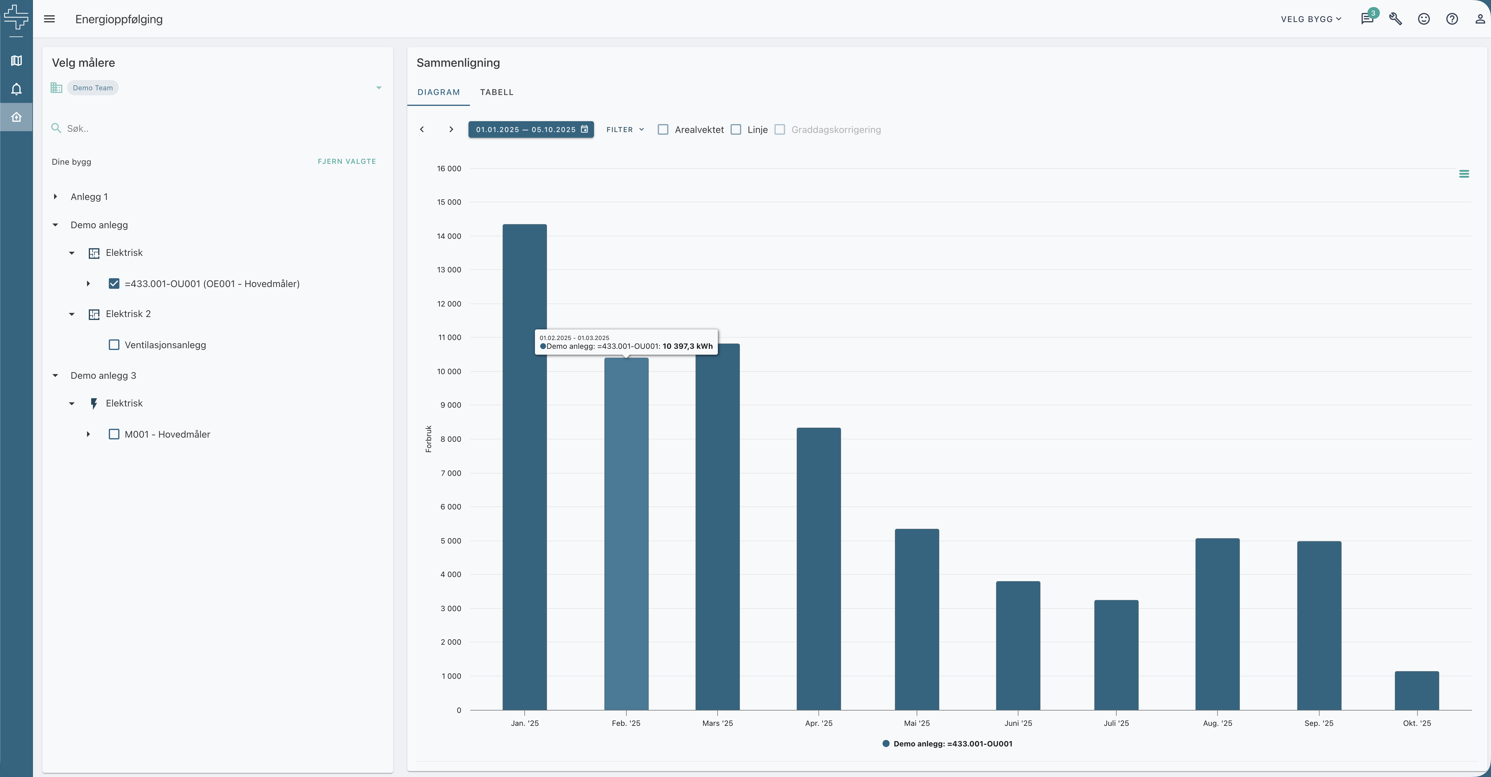 I Energioppfølging kan du enkelt sammenligne energiforbruket mellom anleggene dine ved hjelp av diagrammer og tabeller.