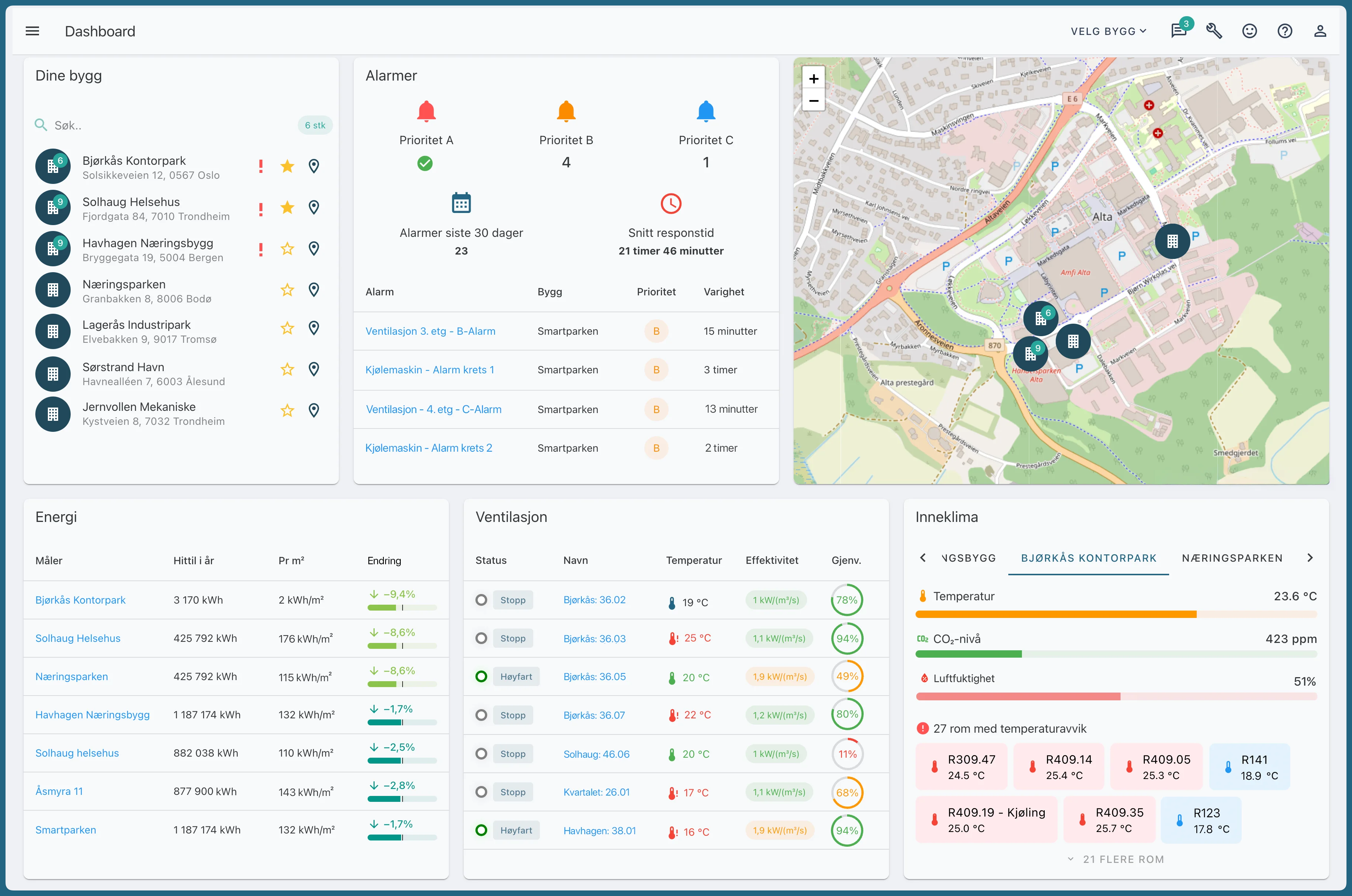 Dashboardet gir deg en samlet oversikt over alle dine bygg og tekniske anlegg.
