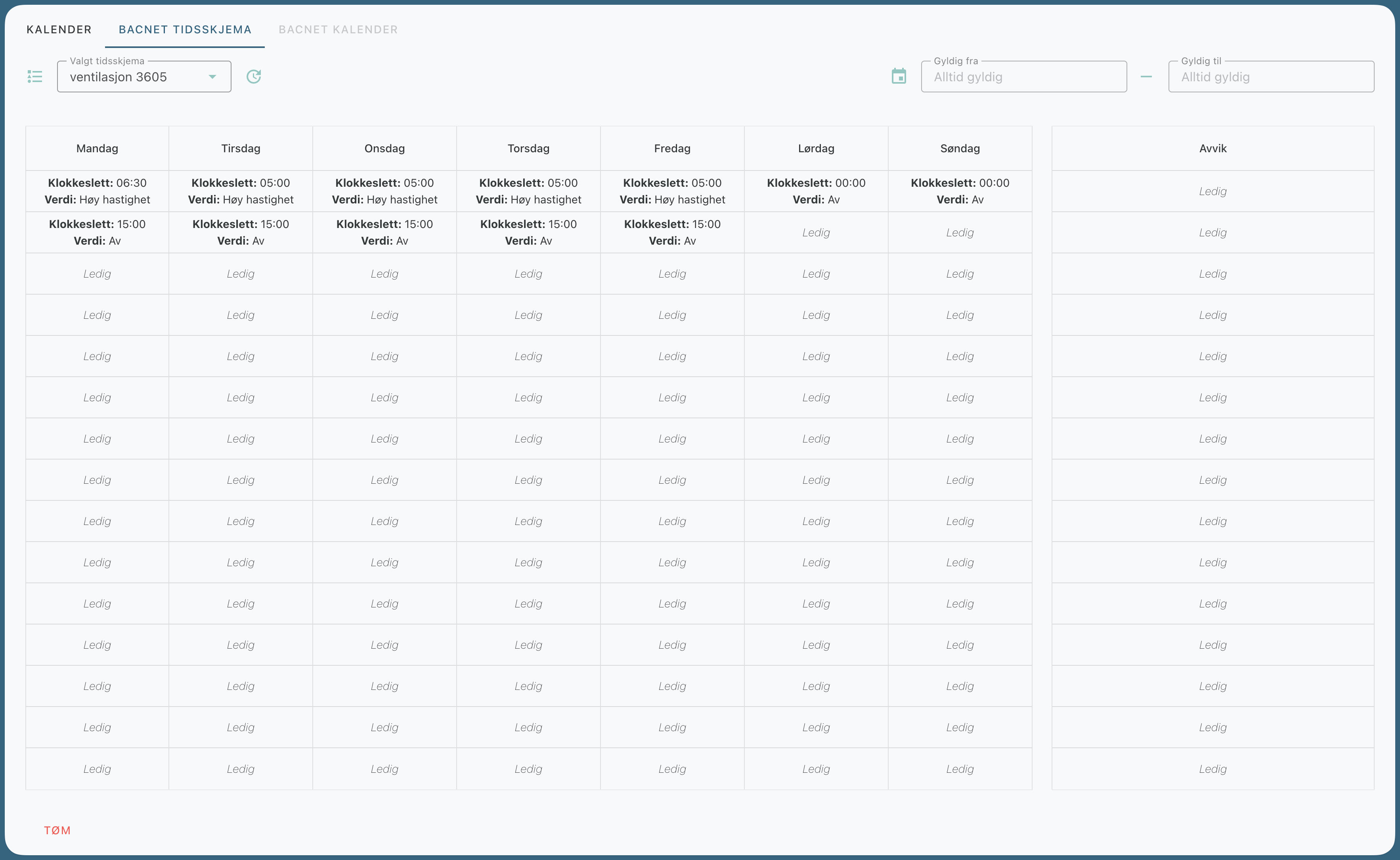Når kalenderobjektet er lagt til, vil en ny fane vises i kalender-modulen. Her kan du administrere tidsskjemaet for ditt ventilasjonsanlegg eller andre systemer.
