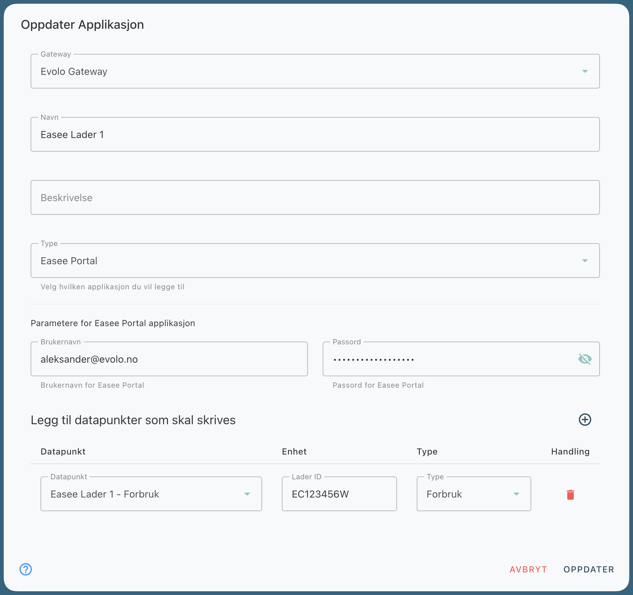 Eksempel på en Easee-applikasjon som skriver forbruket til Evolo.