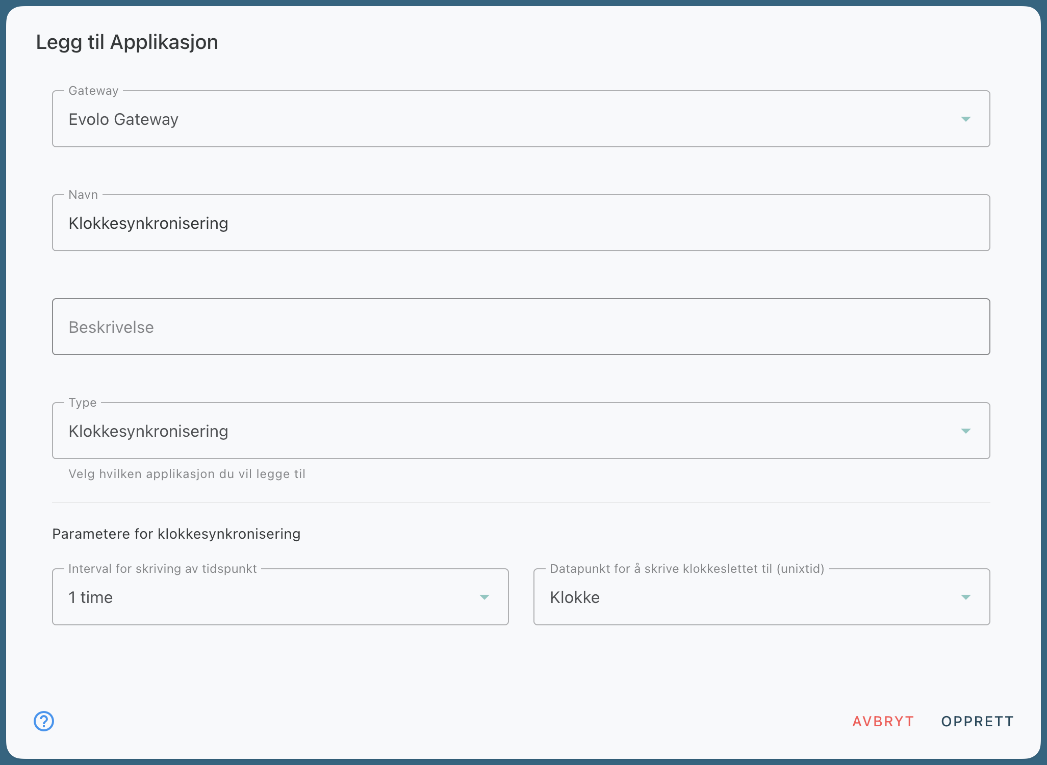 Klokkesynkronisering-appen brukes til å sende dato og klokkeslett til enheter som trenger det. Klokken kommer fra operativsystemet til Evolo Gateway og synkroniseres mot NTP-servere.
