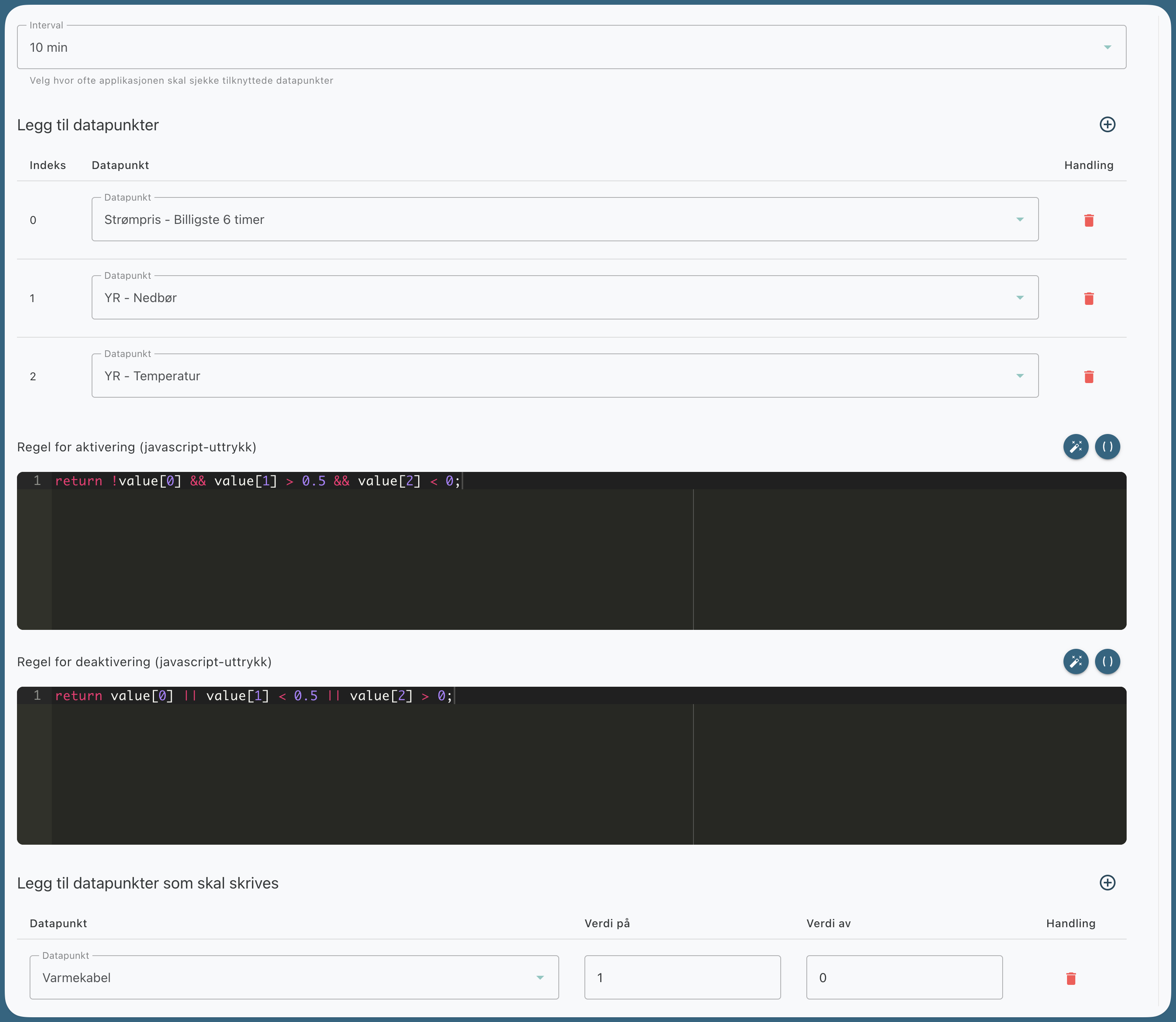 Dette er datapunktene som vil bli sjekket av applikasjonen. - Regel for aktivering