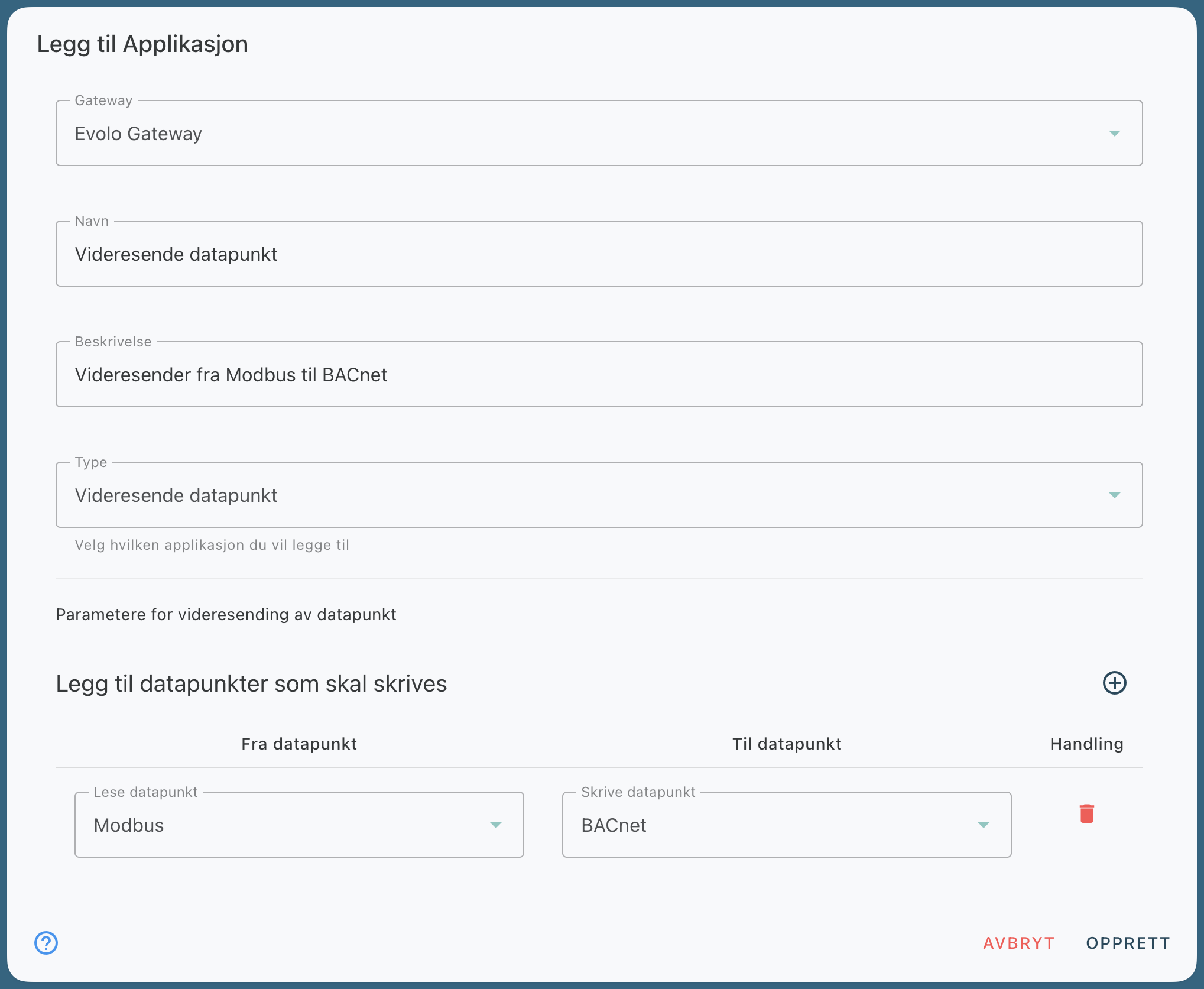 Videresende datapunkt-appen brukes til å videresende datapunkter som er lagt til i Evolo. For eksempel kan man videresende et Modbus datapunkt til et BACnet datapunkt.