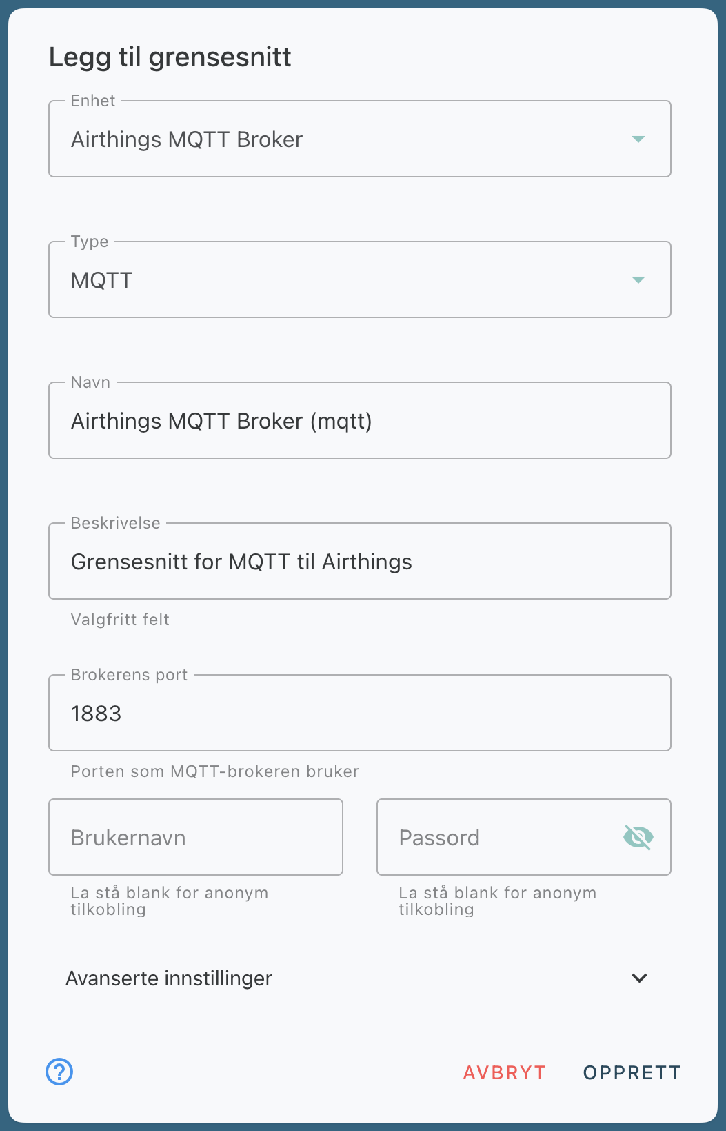 MQTT Client ID | Airthings MQTT Klient ID, f.eks. 2a4832f9-3a76-41fd-9af7-fd1d673f1df2 |