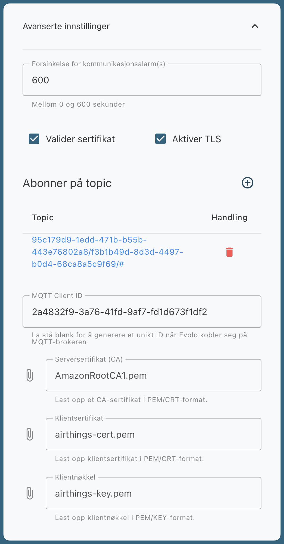 Under avanserte innstillinger, legg inn topics Evolo skal abonnere på og last opp sertifikatene fra Airthings. Aktiver også "Valider sertifikat" og "Aktiver TLS".