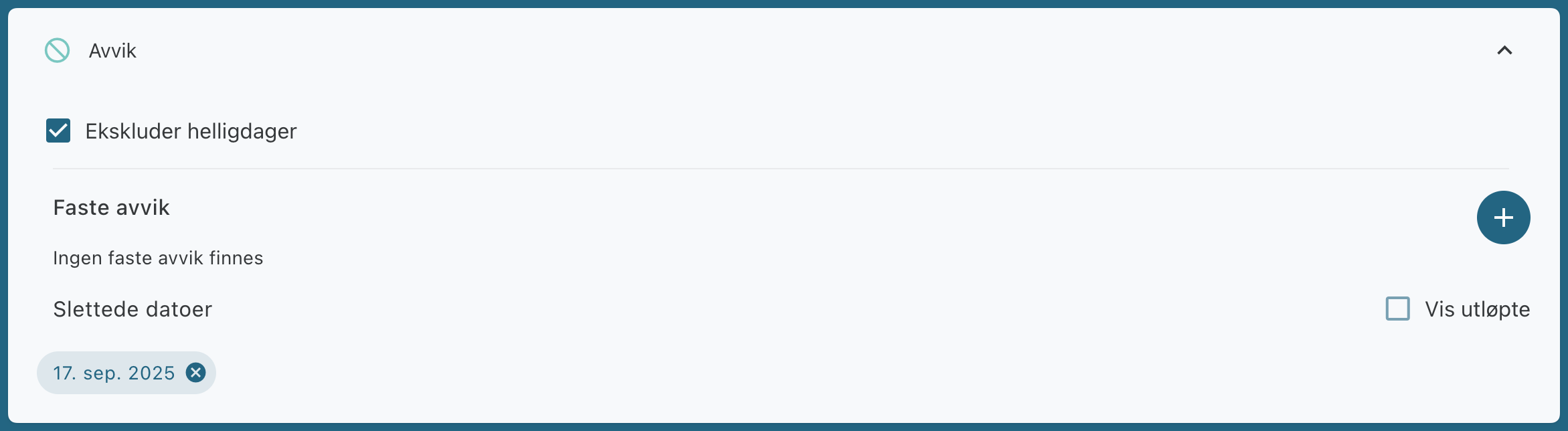 Har du slettet noen dager fra en gjentakende hendelse kan du hente de tilbake igjen under Avvik -> Slettede datoer