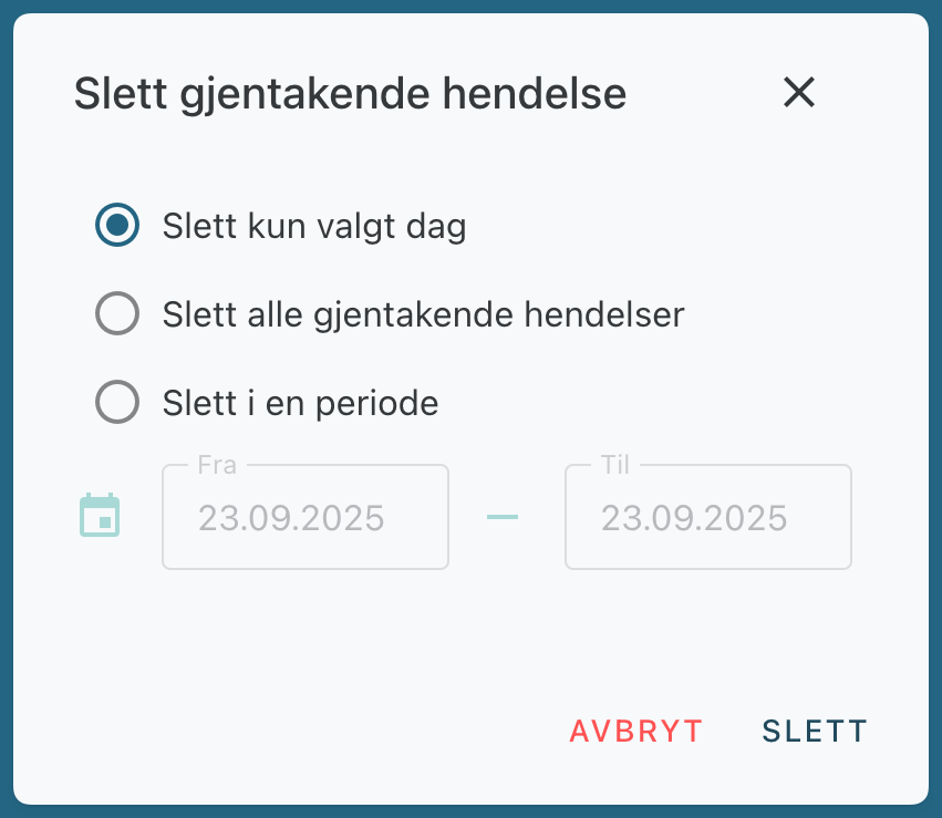 - Du kan slette hendelser i en periode, f.eks. slette en uke.