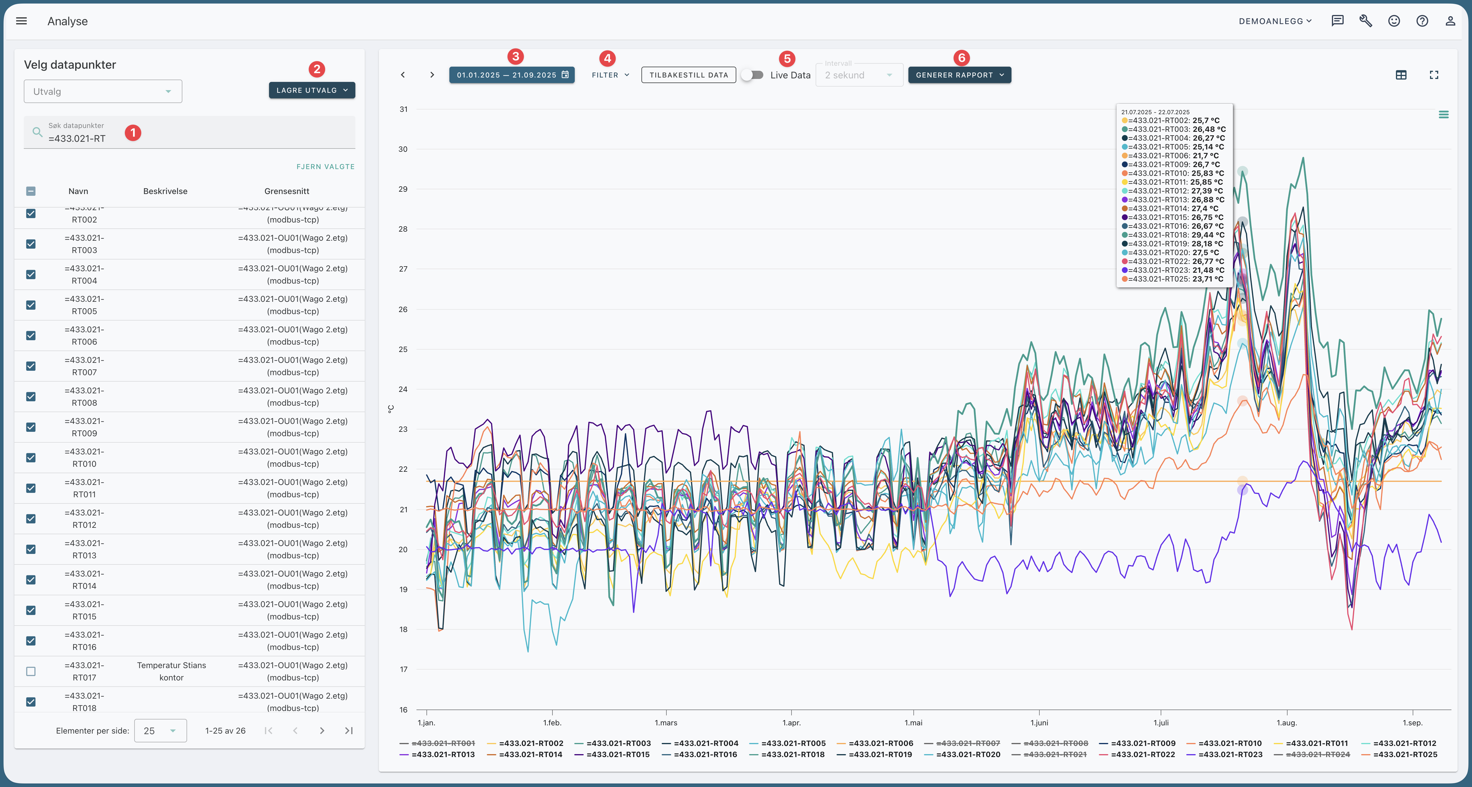 Med analyseverktøyet kan du gjøre et utvalg av ønsket datapunkter for analyse, eller genering av rapport.