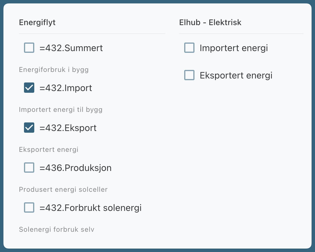 - Merk av for de energimålerne du ønsker å inkludere i rapporten.