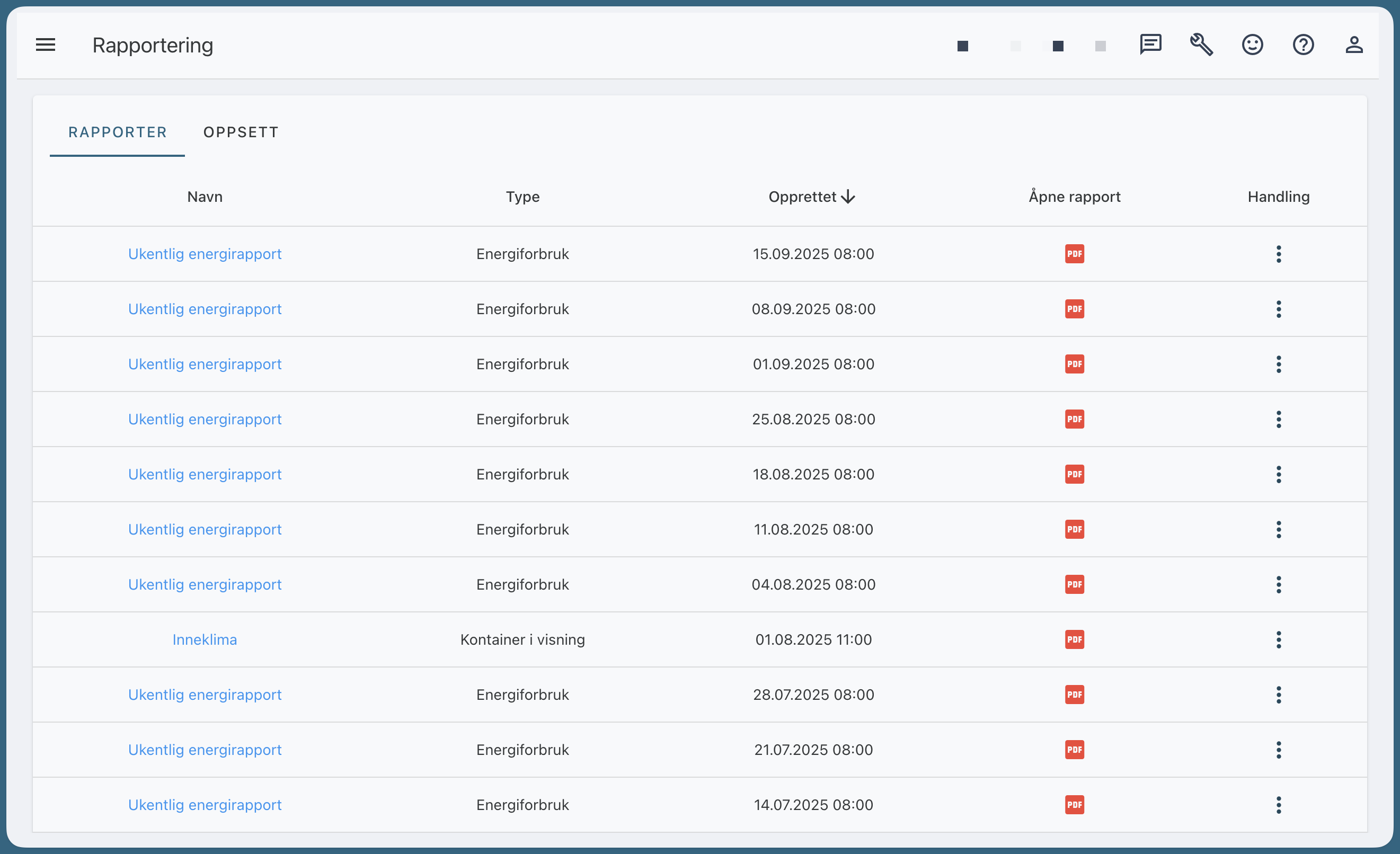I rapporteringsmodulen får du en fullstendig oversikt over alle rapporter som er generert for det valgte anlegget.