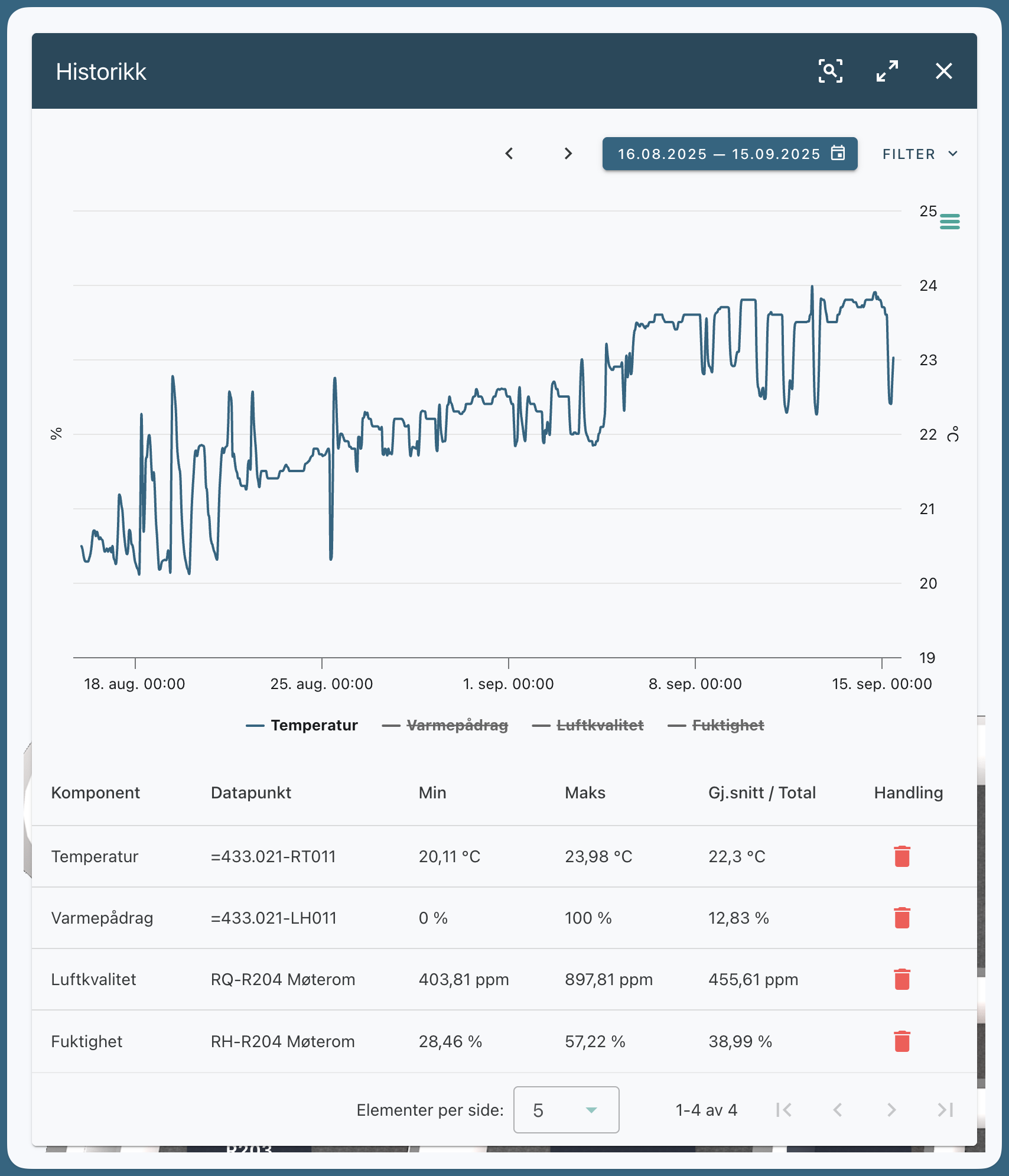 - Finnes det flere enn to datasett, beregner grafen hvilke benevnelse som det er flest av og skalerer fra flest til lavest antall. (finnes to med % og to med ºC og en med kWh blir den siste stående uten skalering mot y-aksen).