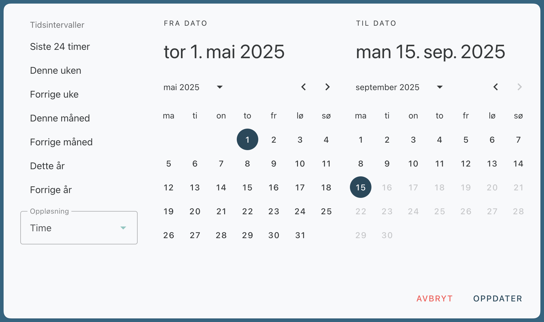 Du kan velge hvilken tidsperiode og oppløsning dataen skal ha ved å klikke fram datovelgeren.